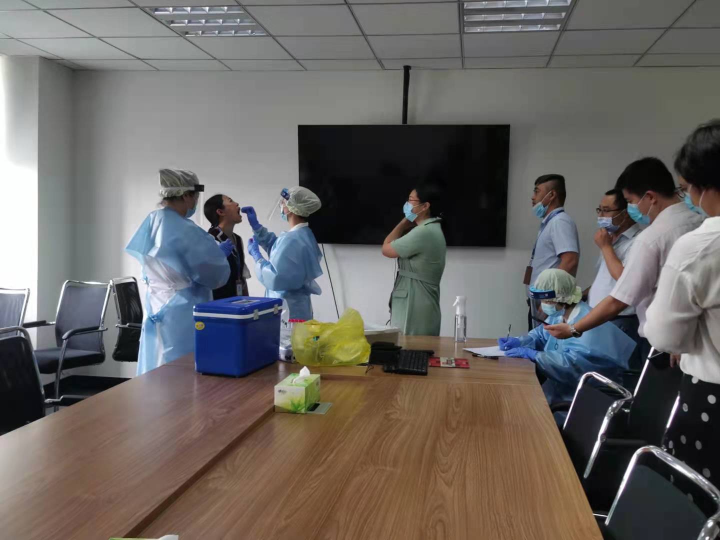為保證各項工作順利推進,公司提前部署,邀請兒童醫(yī)院醫(yī)務(wù)工作者開展本次檢測。 檢測采樣現(xiàn)場,醫(yī)務(wù)人員身著防護服,嚴格按照檢測采樣要求,控制每批次受檢人員數(shù)量,保持安全距離,避免人員聚集,保障檢測工作高效有序進行。按照“愿檢盡檢”的原則,公司在崗員工進行了咽拭子測試采樣。